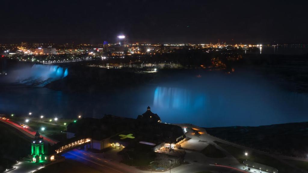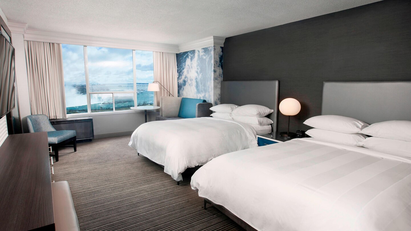 In the Fallsview Boulevard district, this chic high-rise hotel is 1 km from Niagara Fallsview Casino Resort and 4 km from Niagara Falls. Modern rooms have flat-screens, coffeemakers, and city and/or falls views. Wi-Fi is available (fee). Upgraded rooms add fireplaces, whirlpool tubs and kitchenettes, as well as sofabeds. The 1- and 2-bedroom suites offer floor-to-ceiling windows and water views; some are bi-level. There's a lobby cocktail lounge, a coffee shop and a breakfast cafe, as well as a restaurant with a seasonal patio and views of the falls. Other amenities include an indoor pool, a hot tub and a gym, plus 40,000 sq ft of event space.